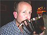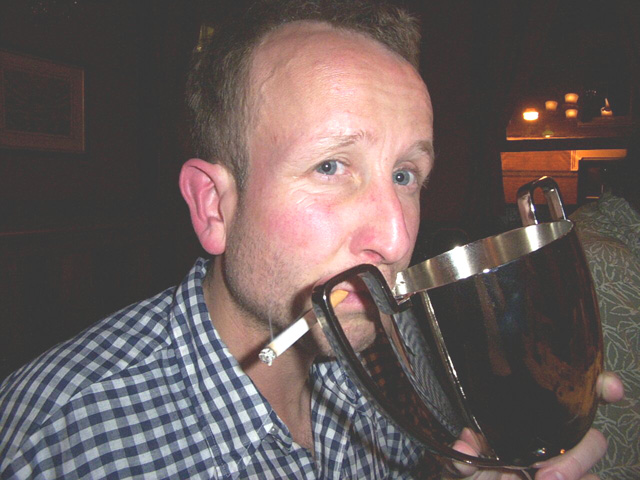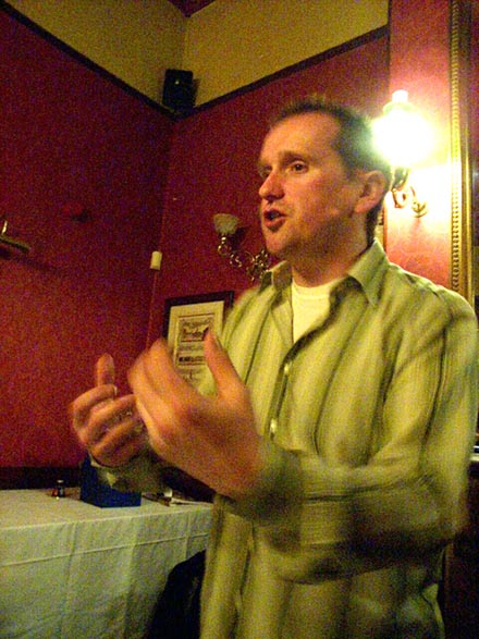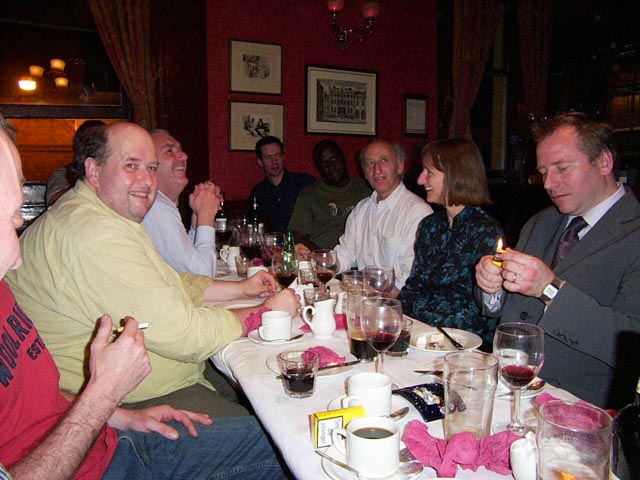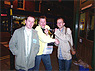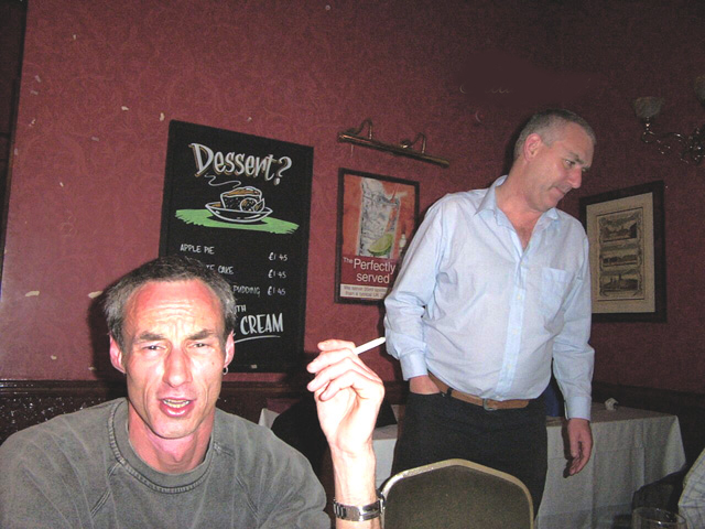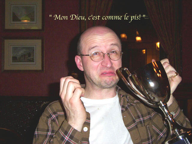 | After the soup catastrophe and smoked pork overload at the Czech Club last year, it was decided that a more up-market venue was the order of the day for 2004's end-of-season-pre-season dinner. Which is why we ended upstairs in a dim boozer of low repute on the corner of Bow Street and Long Acre. In fact, the venue turned out to be surprisingly sympathetic, our dining room transformed by alchohol and good company into a high ceilinged dining chamber worthy of Mr Pickwick. As the mug shots (there's no other word) below reveal, a fine evening was had by all. Jonny Mortimer was the worthy first recipient of our frankly astounding new Player Of The Season trophy (well done Lars). Between mouthfuls of rubbery beef (in truth not that bad) stirring speeches rang out, your secretary drivelled for Britain, the Chairman stood up and then sat down again, the Captain proclaimed us "tigers", Jon wept into his cup - the usual.