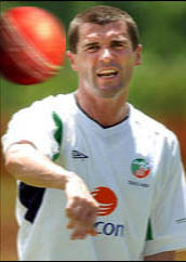 Of course, it was not so very long ago that the gulf between the two sports didn't seem so great - Denis Compton's appearances for both Arsenal and England are legendary, and Ian Botham's spell at Scunthorpe United is well known - but these days football's all-consuming dominance has tended to stretch the gulf between the two sports. But scratch the surface.... Hero 0f '66 Geoff Hurst played cricket for Essex against Lancashire, making him the only first-class cricketer to have won a World Cup winner's medal. West Indies and Somerset super hero Viv Richards both played in the Football World Cup for Antigua & Barbuda and won the Cricket World Cup twice, apparently the only player to have participated in both. Both Gary and Phil Neville could have played cricket professionally. Phil played for Lancashire's 2nd XI, the youngest player ever to do so, and has said that he intends to play cricket again, once he retires from football. "I have said all along that as soon as I finish playing football I will start playing cricket again, because it's a game I love". Gary played for Lancashire's Greenmount CC, the scene of Joel Garner's famous appearance where the 'Big Bird' took 9 wickets for 10 runs, as well as taking the final catch. Drug-crazed former Man U. & Chelsea goalie Mark Bosnich is a big cricket fan and a good friend of Aussie meister-skipper Mark Taylor, and was a lunchtime interview guest on TMS during the last home Ashes tour. Cricket-crazed Italian international superstar striker and left-handed batsman Christian Vieri (I'm not making this up) has frequently named Alan Border as his all-time sporting hero. The dashing Azzuri's prize possession is apparently a bat signed by the entire Australian team. At the other end of football's food chain (at least in team terms), Orc-faced but much loved former Coventry City goalkeeper The closest thing to a Celtic Compton is former Scotland legend, Rangers and Man U. goalkeeper Andy Goram, who kept wicket for Scotland against Australia in 1989. He won three caps in total and was told by Merv Hughes to stick to football. Carlisle United hero Chris Balderstone, whose career at Brunton Park spanned over ten years, was one of the last of the old school cricket/soccer players. He played two Test Matches (Headingly and Oval) for England against the mighty Windies in 1976. He played county cricket for Yorkshire and Leicester, before becoming a highly respected umpire Crisp-crunching wildman Gary Lineker, like the Nevilles, was a talented junior cricketer. He played for Leicester County Cricket Club before joining City FC. He still turns out, doubtless in the most immaculate of whites, to bat for the Lords Taveners and for Wanderersesque celebrity side Bunbury Cricket Club for whom Arsenal's Ian Wright has also played. Barely believable though it may sound, I have it on good authority that legendary Chelsea assassin Ron 'Chopper' Harris was actually offered terms by Middlesex but, in the words of my source, he wisely "decided that football offered more opportunities for violence". If anyone can shed some light on this staggering assertion, please contact your secretario. But most peculiar of all were repeated reports last year of Roy Keane attending Lancashire matches at Old Trafford. Could the Cork axe murderer be emerging from the cricket closet?? This secretly taken photo showing Keano practicing what appears to be a big rippa of a googly certainly seems proof positive.