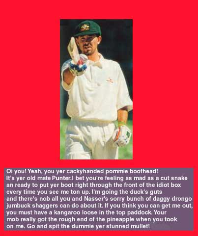 | Gaf's admiration and respect for Australia's Ricky Ponting is profound, and the two have exchanged Christmas cards over many years. Ricky's Xmas 2002 Ashes tour card, kindly donated to the museum by our demon leg spinner, sums up the warmth of feeling between these two. |
