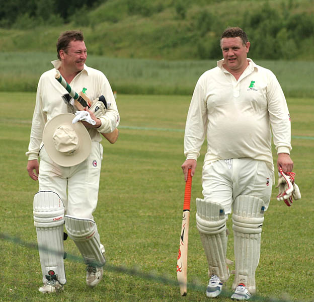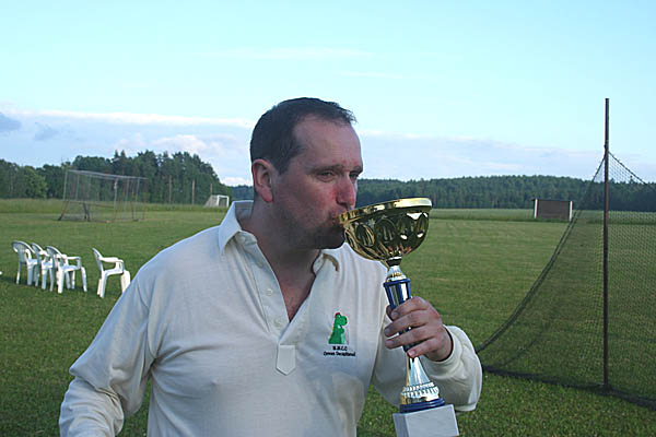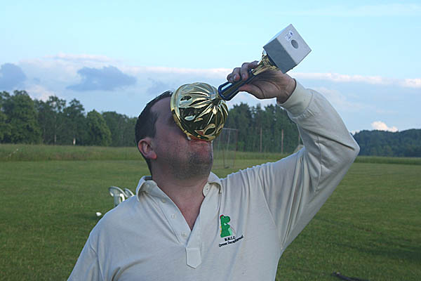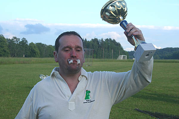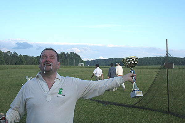 | I don't doubt for one second that I speak for everyone when I say that Mighty Wanderers' first overseas tour was an event that truly surpassed all expectations. Over three days we and fellow-travellers Salix enjoyed the boundless hospitality and good company of the members of Guttsta CC, our incredibly friendly and enthusiastic hosts, in the picturesque small town of Kolsva. "If you build it, they will come" - they did, and we did, to a remarkable cricket pitch (the northernmost in the world) cut from a corner of a great fallow field which stretched far into the distance, eventually bounded by the looming wolf-haunted pine forest of wildest Scandanavia. The setting, especially during the warm summer evenings, was little short of idyllic. Fuelled by the nightly barbeque and (thankfully small) tins of Sweden's incredibly strong beers, MWcc not only defeated Salix for the second time in nearly as many weeks, but walked off with the 2007 Midsummer Cup itself.